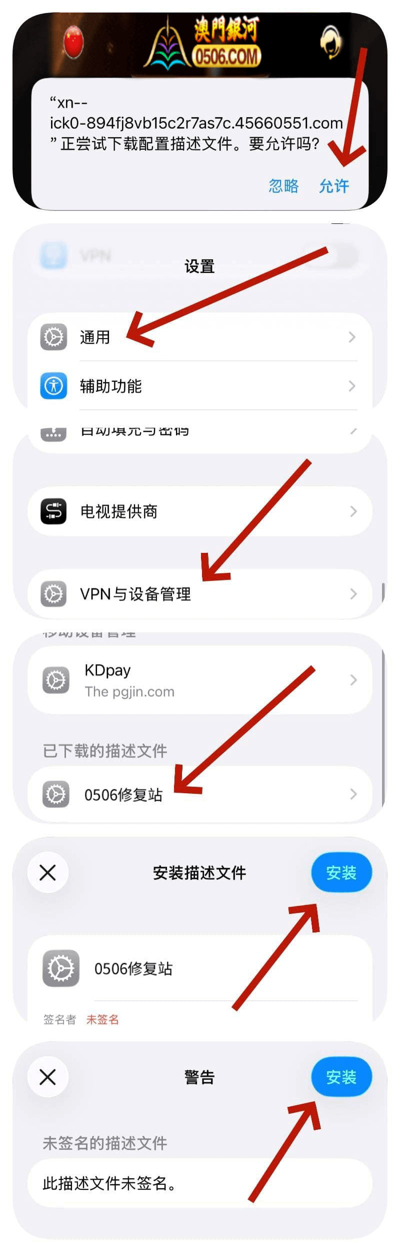 点击[允许]后 → 返回手机桌面 → 通用 → VPN与设备管理 → 点击[0506修复工具] → 点击右上角[安装] → 输入锁屏密码 → 右上角"安装" → 完成